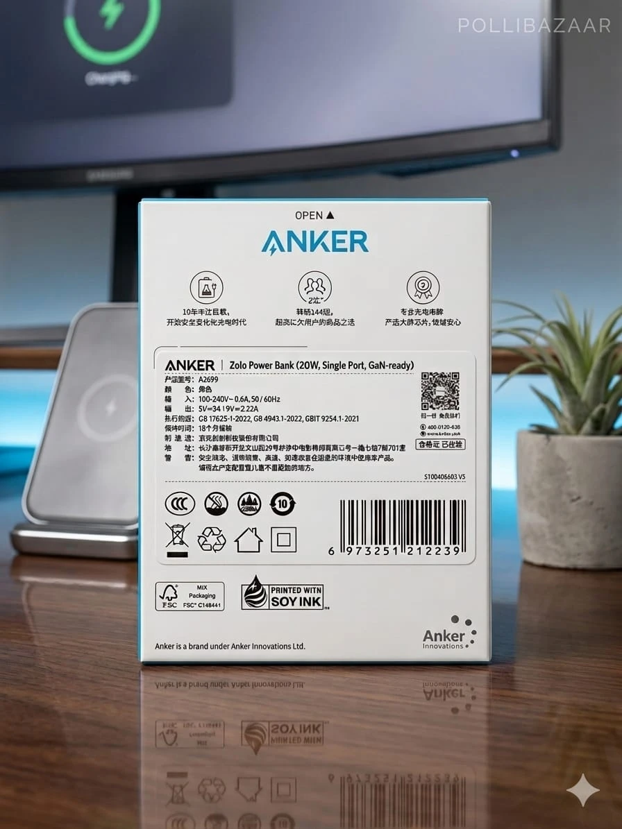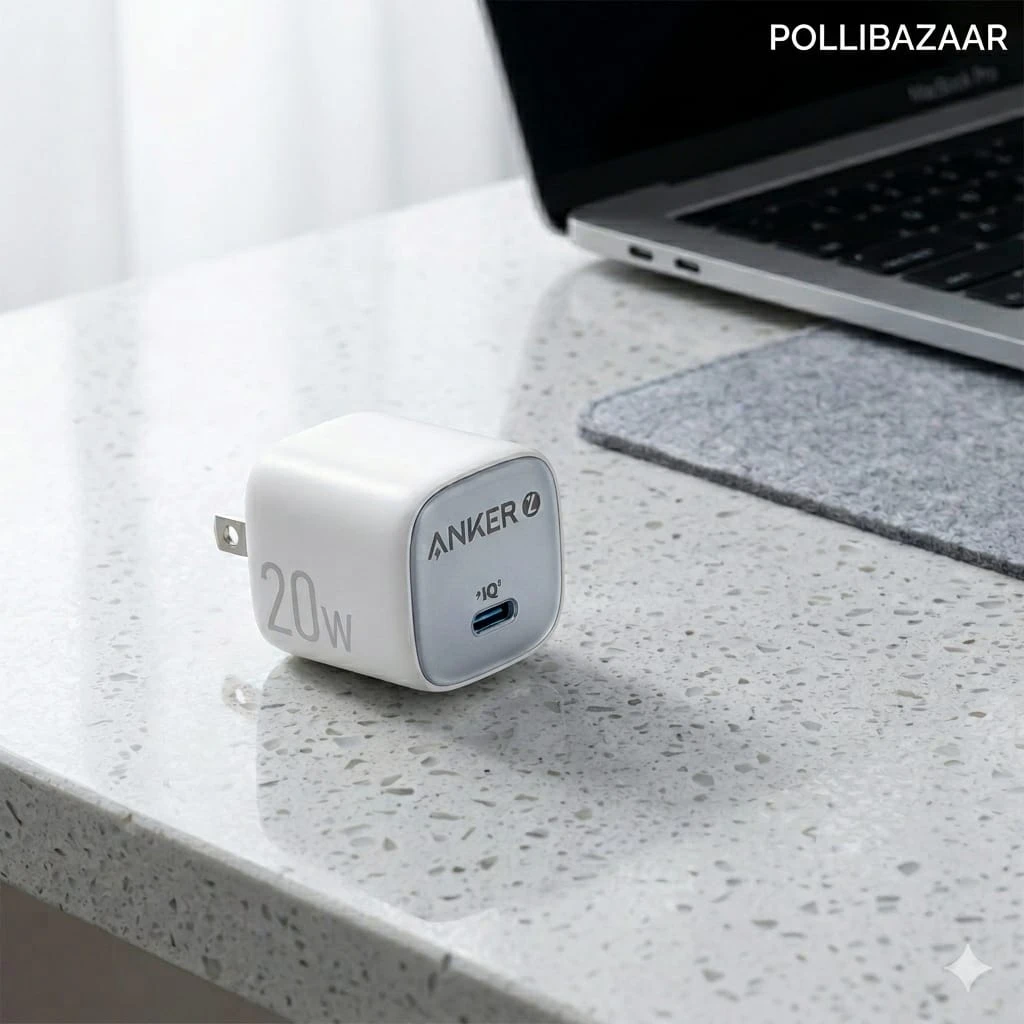 "Get the Anker Zolo 20W IQ & PD Adapter at PolliBazaar.com with an 18-month official warranty. This compact and powerful charger ensures safe, high-speed charging for your iPhone and Android devices."